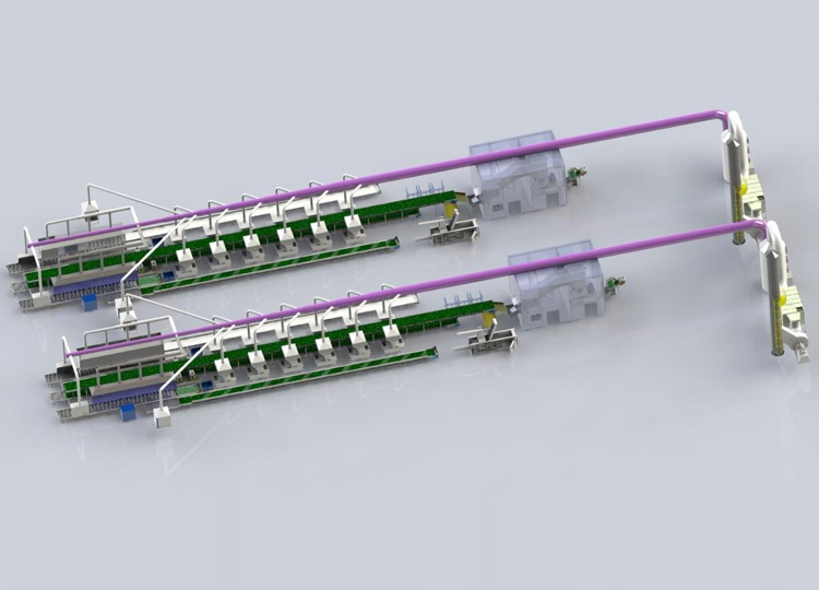 本套设备由空调皮带输送线、拆解工作台、冷媒回收机、电机打孔、压缩机沥油平台、金属打包机、粉碎设备、除尘设备、1套电控系统组成。拆解工作台布置在双层输送线的两边,工作台上设有吸风口,吸风口通过除尘管道与除尘器相连接,尾气通过除尘器进行除尘处理,并通过烟囱排出室外。