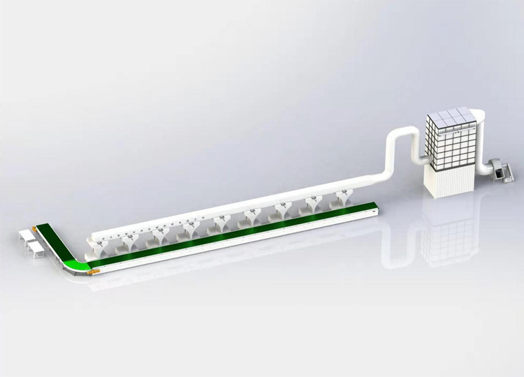 待拆解电视经皮带输送机输送至各个工作台,工人拆解过程中含尘气体经工作台吸风系统收集,然后在用管集中收集经风机引入袋式除尘器,经由分风挡板废气粉尘均匀分布在每支率带上,经滤袋过滤,粉尘被阻留在滤袋外壁,净化后的气体通过滤袋经排气管排出。当滤袋表面负荷的粉尘增加达到一定量时,通过脉冲喷吹装置,使滤袋瞬间膨胀,使滤袋表面的粉尘脱落至灰料仓中,厂家自行回收。
