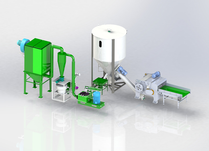 我公司是一家专业的磨粉设备厂家,结合多年经验、粉体行业现状,生产了全套优秀的磨粉设备,并为客户量身打造科学、合理的磨粉生产线。破碎磨粉生产线以磨粉为主,是由磨粉机(主机部分)、管道装置、破碎机、斗式提升机、电磁振动给料机、料仓、配电柜等设备构成,其工艺流程如下:大块物料经破碎机初步破碎至所需粒度后,由提料机自下往上的运送至料仓内由电磁振动给料机均匀、定量给入到磨粉机内研磨处理,粉磨后的细粉直接定量装袋。| 序号 | 名称 | 数量 | 配 置 | 备注 | |