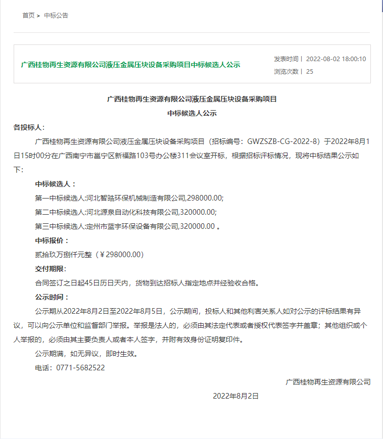 热烈庆祝广西桂物再生资源有限公司液压金属压块机项目中标